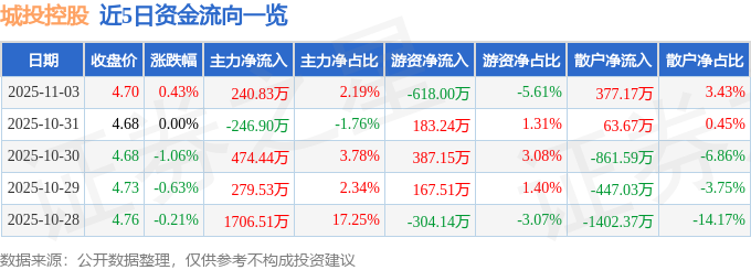 证券之星消息,截至2025年11月3日收盘,城投控股(600649)报收于4.7元,上涨0.43%,换手率0.94%,成交量23.51万手,成交额1.1亿元。