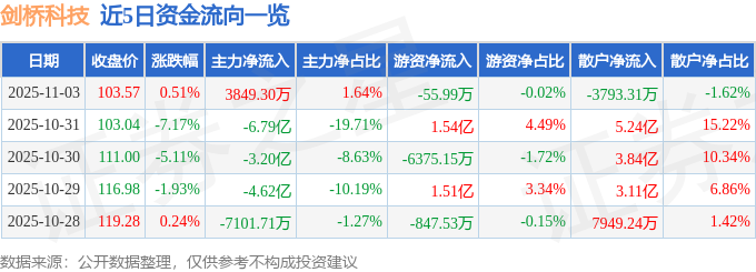 11月3日的资金流向数据方面,主力资金净流入3849.3万元,占总成交额1.64%,游资资金净流出55.99万元,占总成交额0.02%,散户资金净流出3793.31万元,占总成交额1.62%。