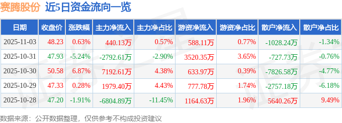 证券之星消息,截至2025年11月3日收盘,赛腾股份(603283)报收于48.23元,上涨0.63%,换手率5.86%,成交量16.31万手,成交额7.68亿元。