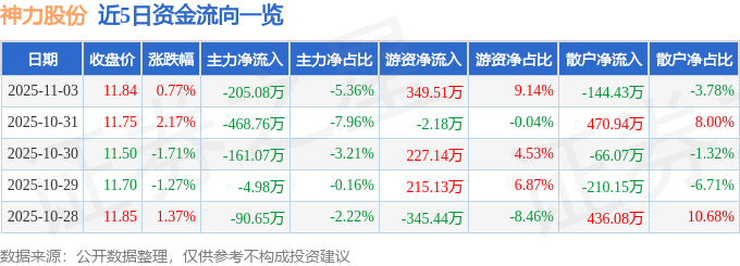 证券之星消息,截至2025年11月3日收盘,神力股份(603819)报收于11.84元,上涨0.77%,换手率1.49%,成交量3.24万手,成交额3823.75万元。