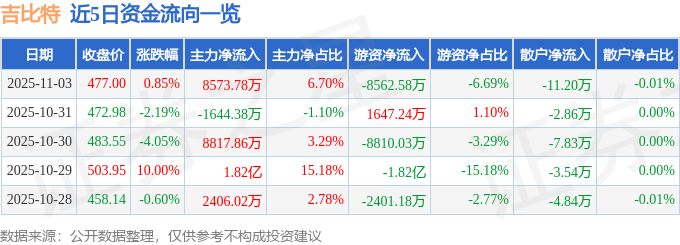 11月3日的资金流向数据方面,主力资金净流入8573.78万元,占总成交额6.7%,游资资金净流出8562.58万元,占总成交额6.69%,散户资金净流出11.2万元,占总成交额0.01%。