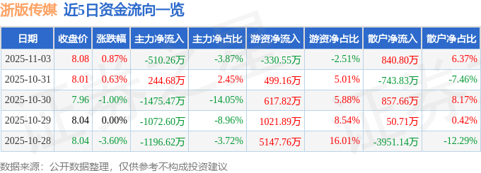 证券之星消息,截至2025年11月3日收盘,浙版传媒(601921)报收于8.08元,上涨0.87%,换手率0.74%,成交量16.4万手,成交额1.32亿元。