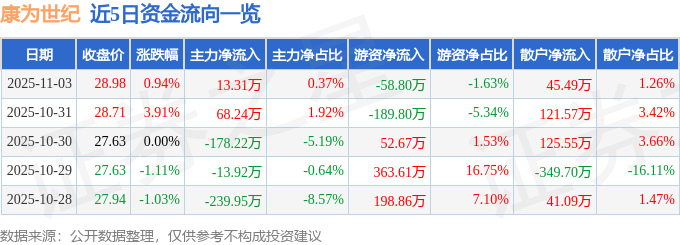 证券之星消息,截至2025年11月3日收盘,康为世纪(688426)报收于28.98元,上涨0.94%,换手率3.33%,成交量1.27万手,成交额3603.07万元。