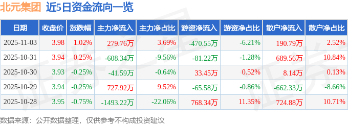 证券之星消息,截至2025年11月3日收盘,北元集团(601568)报收于3.98元,上涨1.02%,换手率0.48%,成交量19.11万手,成交额7572.91万元。