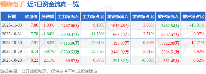 证券之星消息,截至2025年11月3日收盘,铜峰电子(600237)报收于7.86元,上涨1.03%,换手率5.46%,成交量33.95万手,成交额2.65亿元。