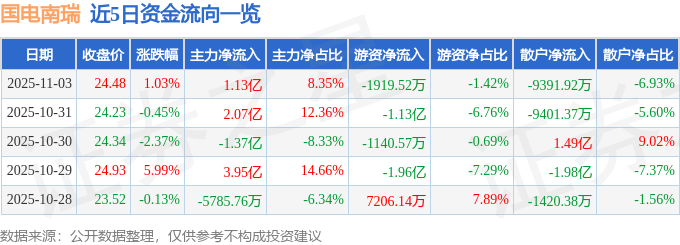 证券之星消息,截至2025年11月3日收盘,国电南瑞(600406)报收于24.48元,上涨1.03%,换手率0.7%,成交量55.74万手,成交额13.55亿元。