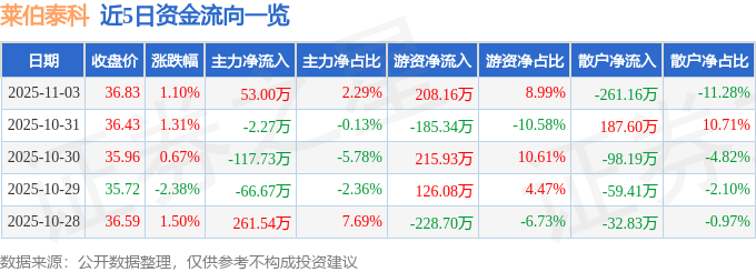 证券之星消息,截至2025年11月3日收盘,莱伯泰科(688056)报收于36.83元,上涨1.1%,换手率0.93%,成交量6271.0手,成交额2314.79万元。