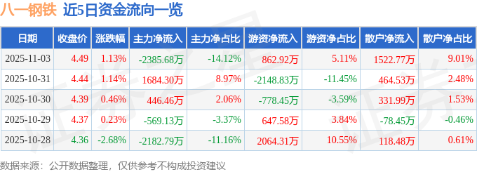 证券之星消息,截至2025年11月3日收盘,八一钢铁(600581)报收于4.49元,上涨1.13%,换手率2.48%,成交量37.96万手,成交额1.69亿元。