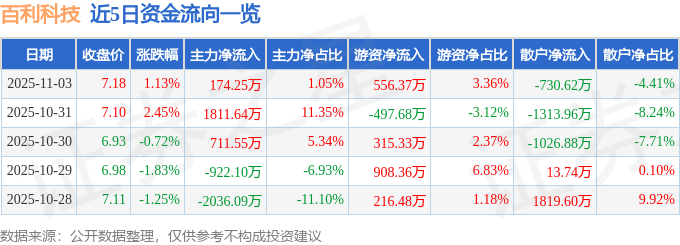 证券之星消息,截至2025年11月3日收盘,百利科技(603959)报收于7.18元,上涨1.13%,换手率4.75%,成交量23.31万手,成交额1.66亿元。