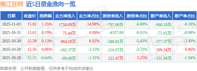 证券之星消息,截至2025年11月3日收盘,锦江在线(600650)报收于15.82元,上涨1.35%,换手率1.91%,成交量7.44万手,成交额1.17亿元。