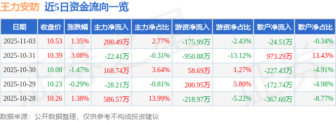 证券之星消息,截至2025年11月3日收盘,王力安防(605268)报收于10.53元,上涨1.35%,换手率1.57%,成交量6.89万手,成交额7233.6万元。