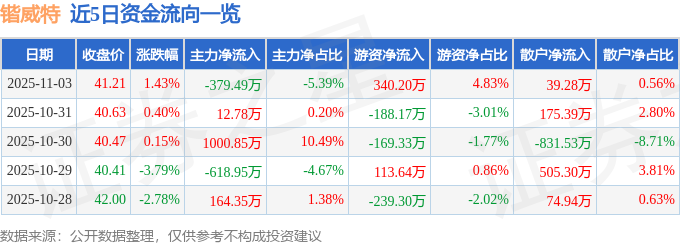 11月3日的资金流向数据方面,主力资金净流出379.49万元,占总成交额5.39%,游资资金净流入340.2万元,占总成交额4.83%,散户资金净流入39.28万元,占总成交额0.56%。