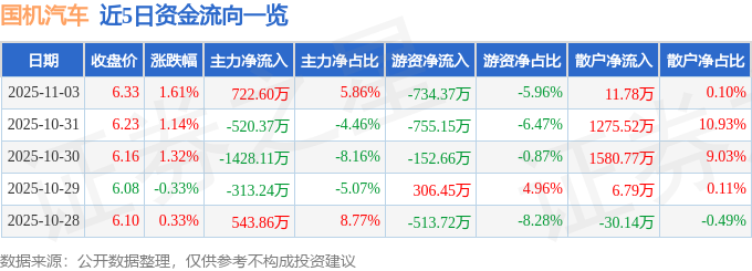 证券之星消息,截至2025年11月3日收盘,国机汽车(600335)报收于6.33元,上涨1.61%,换手率1.31%,成交量19.59万手,成交额1.23亿元。
