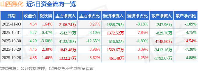 证券之星消息,截至2025年11月3日收盘,山西焦化(600740)报收于4.34元,上涨1.64%,换手率2.05%,成交量52.55万手,成交额2.27亿元。