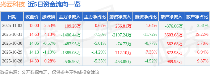 证券之星消息,截至2025年11月3日收盘,光云科技(688365)报收于15.0元,上涨2.53%,换手率2.58%,成交量10.97万手,成交额1.63亿元。