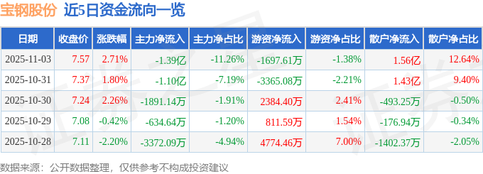 证券之星消息,截至2025年11月3日收盘,宝钢股份(600019)报收于7.57元,上涨2.71%,换手率0.75%,成交量163.13万手,成交额12.31亿元。