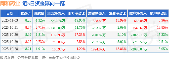 证券之星消息,截至2025年11月3日收盘,同和药业(300636)报收于8.23元,下跌1.32%,换手率3.71%,成交量13.62万手,成交额1.12亿元。