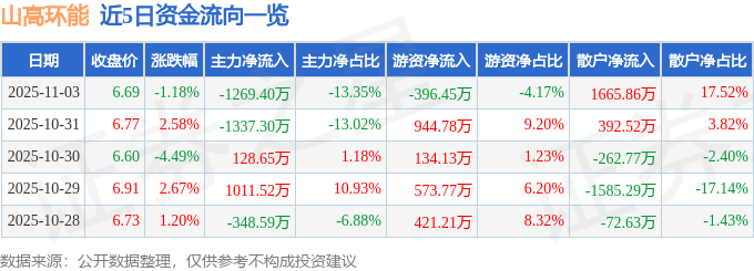证券之星消息,截至2025年11月3日收盘,山高环能(000803)报收于6.69元,下跌1.18%,换手率3.1%,成交量14.26万手,成交额9506.13万元。