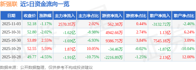 证券之星消息,截至2025年11月3日收盘,新强联(300850)报收于52.18元,下跌1.17%,换手率8.19%,成交量24.63万手,成交额12.73亿元。