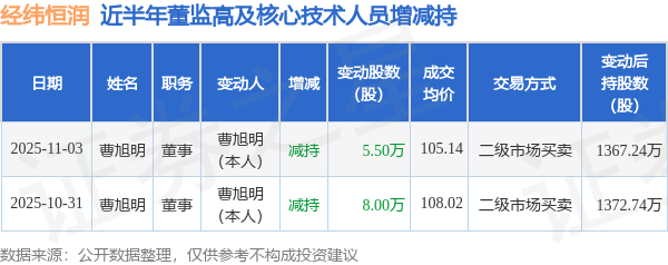 证券之星消息,根据11月3日市场公开信息、上市公司公告及交易所披露数据整理,经纬恒润(688326)最新董监高及相关人员股份变动情况:2025年10月31日至2025年11月3日公司董事曹旭明共减持公司股份13.5万股,占公司总股本为0.1125%。变动期间公司股价上涨0.15%,11月3日当日收盘报105.3元。