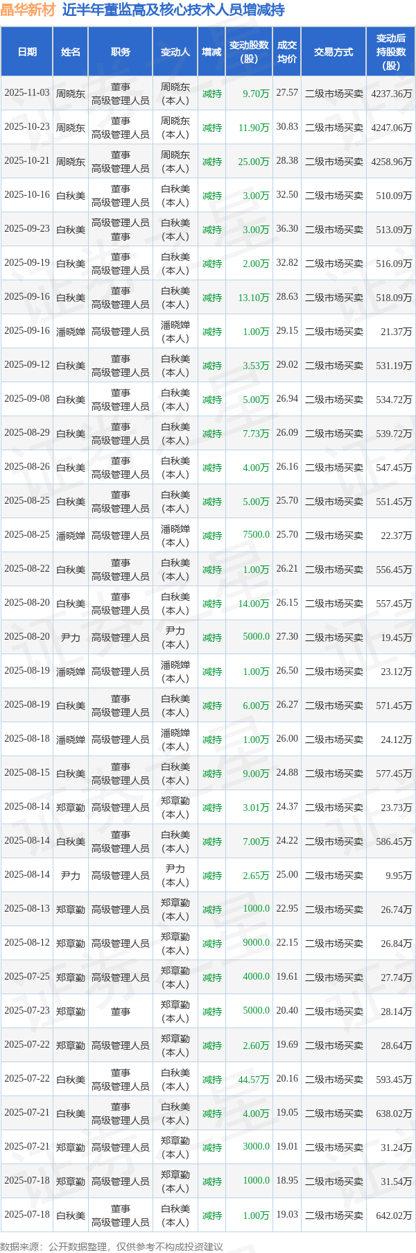 晶华新材近半年内的董监高及核心技术人员增减持详情如下:
