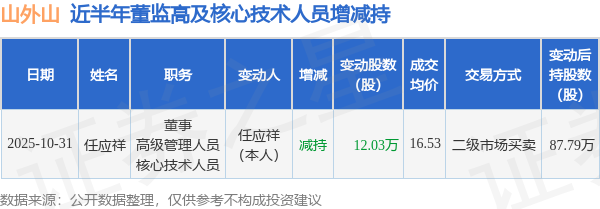 证券之星消息,根据11月3日市场公开信息、上市公司公告及交易所披露数据整理,山外山(688410)最新董监高及相关人员股份变动情况:2025年10月31日公司董事,高级管理人员,核心技术人员任应祥共减持公司股份12.03万股,占公司总股本为0.0374%。变动期间公司股价上涨0.18%,10月31日当日收盘报16.49元。