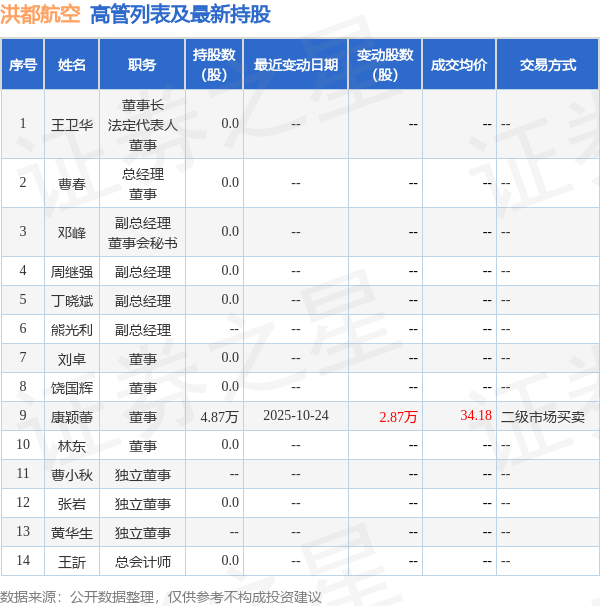 洪都航空的高管列表及最新持股情况如下: