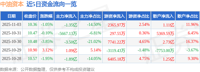 证券之星消息,截至2025年11月3日收盘,中油资本(000617)报收于10.36元,下跌1.05%,换手率0.71%,成交量90.37万手,成交额9.31亿元。