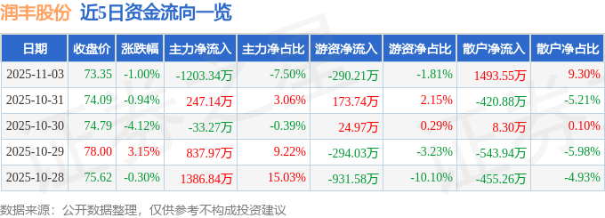 证券之星消息,截至2025年11月3日收盘,润丰股份(301035)报收于73.35元,下跌1.0%,换手率0.79%,成交量2.2万手,成交额1.61亿元。