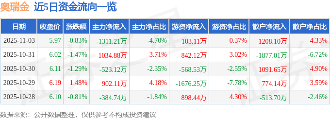 证券之星消息,截至2025年11月3日收盘,奥瑞金(002701)报收于5.97元,下跌0.83%,换手率1.83%,成交量46.82万手,成交额2.79亿元。
