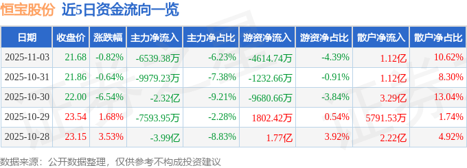证券之星消息,截至2025年11月3日收盘,恒宝股份(002104)报收于21.68元,下跌0.82%,换手率8.13%,成交量48.75万手,成交额10.5亿元。