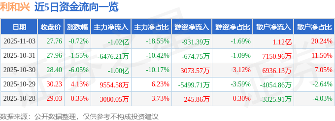 证券之星消息,截至2025年11月3日收盘,利和兴(301013)报收于27.76元,下跌0.72%,换手率10.65%,成交量20.16万手,成交额5.52亿元。