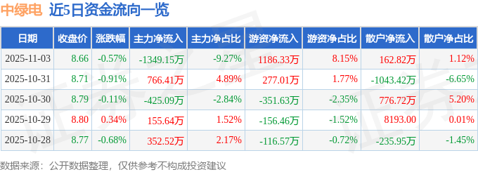 证券之星消息,截至2025年11月3日收盘,中绿电(000537)报收于8.66元,下跌0.57%,换手率0.81%,成交量16.83万手,成交额1.45亿元。