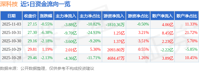 证券之星消息,截至2025年11月3日收盘,深科技(000021)报收于27.15元,下跌0.55%,换手率8.62%,成交量135.5万手,成交额35.88亿元。