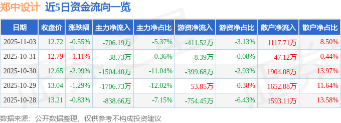 证券之星消息,截至2025年11月3日收盘,郑中设计(002811)报收于12.72元,下跌0.55%,换手率3.66%,成交量10.36万手,成交额1.31亿元。
