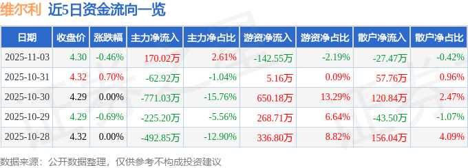 证券之星消息,截至2025年11月3日收盘,维尔利(300190)报收于4.3元,下跌0.46%,换手率1.89%,成交量15.19万手,成交额6511.46万元。