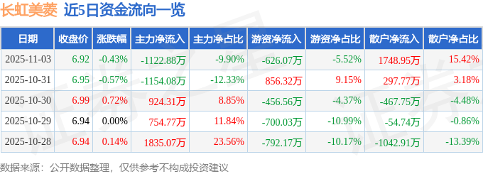 证券之星消息,截至2025年11月3日收盘,长虹美菱(000521)报收于6.92元,下跌0.43%,换手率1.88%,成交量16.43万手,成交额1.13亿元。