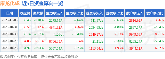 证券之星消息,截至2025年11月3日收盘,康龙化成(300759)报收于33.45元,下跌0.18%,换手率1.81%,成交量25.71万手,成交额8.63亿元。