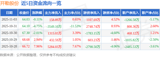 证券之星消息,截至2025年11月3日收盘,开勒股份(301070)报收于64.03元,下跌0.11%,换手率6.47%,成交量3.84万手,成交额2.45亿元。