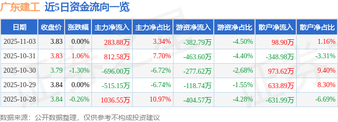 证券之星消息,截至2025年11月3日收盘,广东建工(002060)报收于3.83元,上涨0.0%,换手率1.43%,成交量22.28万手,成交额8502.72万元。