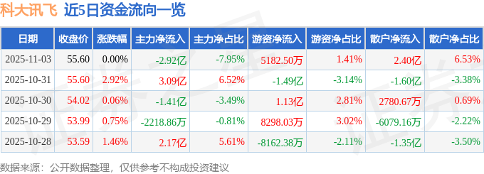 证券之星消息,截至2025年11月3日收盘,科大讯飞(002230)报收于55.6元,上涨0.0%,换手率3.03%,成交量66.27万手,成交额36.73亿元。