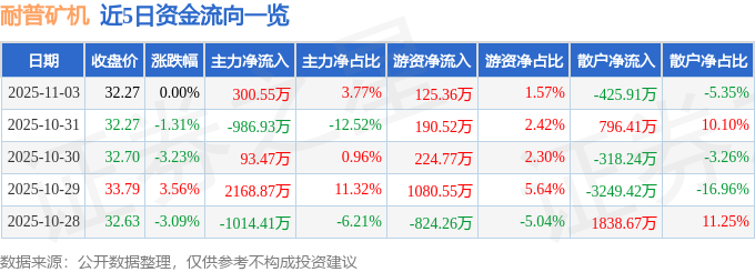 证券之星消息,截至2025年11月3日收盘,耐普矿机(300818)报收于32.27元,上涨0.0%,换手率2.26%,成交量2.48万手,成交额7968.01万元。