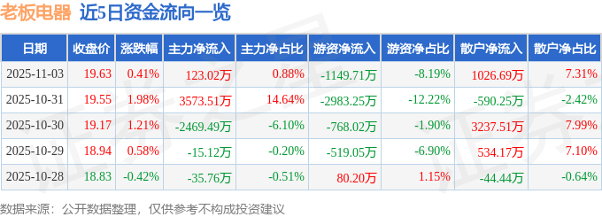 证券之星消息,截至2025年11月3日收盘,老板电器(002508)报收于19.63元,上涨0.41%,换手率0.77%,成交量7.17万手,成交额1.4亿元。