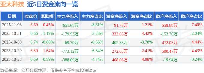 证券之星消息,截至2025年11月3日收盘,亚太科技(002540)报收于6.69元,上涨0.45%,换手率1.31%,成交量11.43万手,成交额7567.68万元。