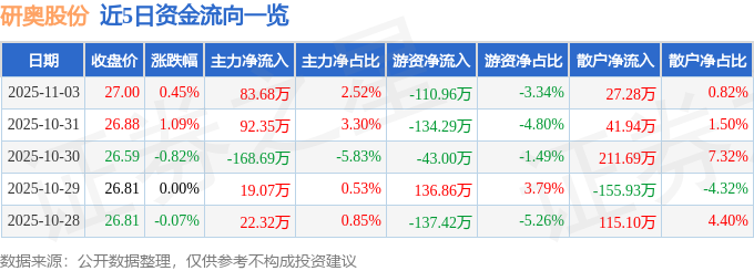 证券之星消息,截至2025年11月3日收盘,研奥股份(300923)报收于27.0元,上涨0.45%,换手率1.61%,成交量1.23万手,成交额3325.62万元。