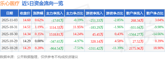 证券之星消息,截至2025年11月3日收盘,乐心医疗(300562)报收于14.6元,上涨0.62%,换手率3.74%,成交量6.06万手,成交额8814.07万元。