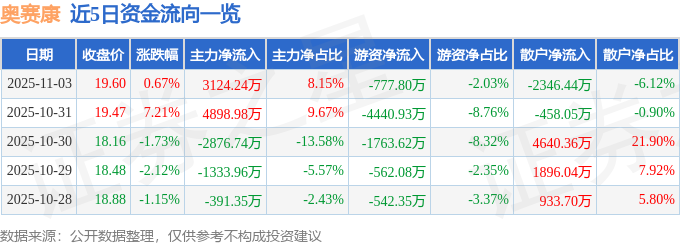 证券之星消息,截至2025年11月3日收盘,奥赛康(002755)报收于19.6元,上涨0.67%,换手率2.12%,成交量19.68万手,成交额3.84亿元。