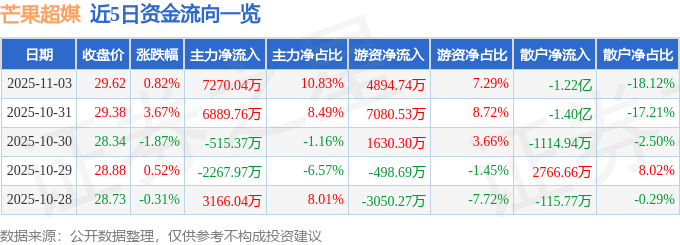 证券之星消息,截至2025年11月3日收盘,芒果超媒(300413)报收于29.62元,上涨0.82%,换手率2.24%,成交量22.89万手,成交额6.71亿元。