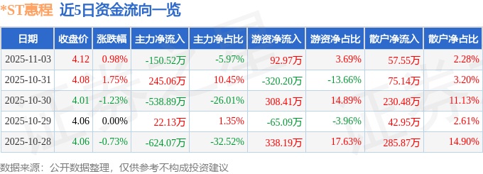 证券之星消息,截至2025年11月3日收盘,*ST惠程(002168)报收于4.12元,上涨0.98%,换手率0.79%,成交量6.2万手,成交额2522.51万元。