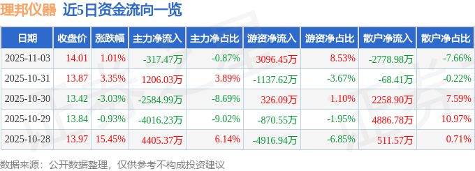 证券之星消息,截至2025年11月3日收盘,理邦仪器(300206)报收于14.01元,上涨1.01%,换手率7.68%,成交量25.98万手,成交额3.63亿元。